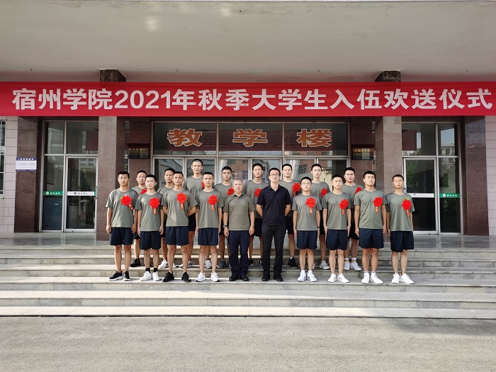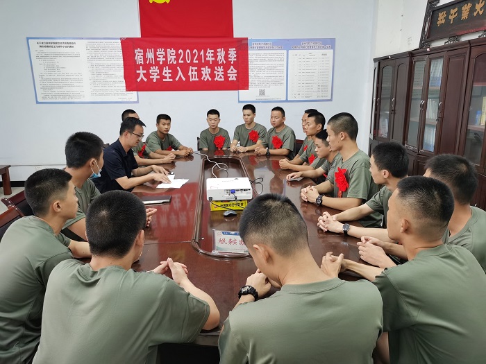 9月12日上午,宿州学院2021年秋季入伍大学生欢送会暨欢送仪式在汴河路校区召开,院武装部相关人员和2021年秋季入伍学生代表参会。