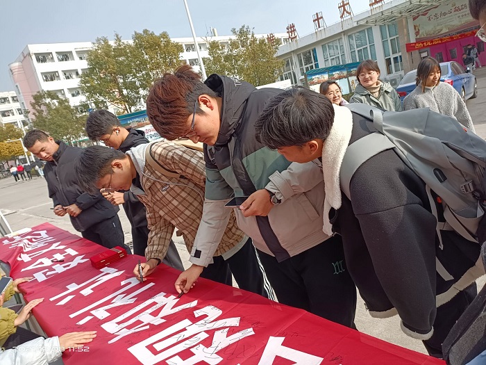 活动期间,在一食堂门口举行了全国交通安全日主题展板宣传活动,展示了交通安全常识、交通违法的几种形式、常见交通安全标识等交通安全小知识,吸引了大量师生观看学习。在“守法规知礼让、安全文明出行”签名活动现场,宣传人员向同学们宣讲校园及周边交通安全注意事项,帮助同学们全面地了解交通法规和遵守交通纪律,倡导珍爱生命,摈弃交通陋习,养成良好交通习惯,争做交通安全的参与者和宣传者。同学们积极踊跃地参与横幅签名活动,承诺将遵守交通法律法规,牢记出行安全相关知识。