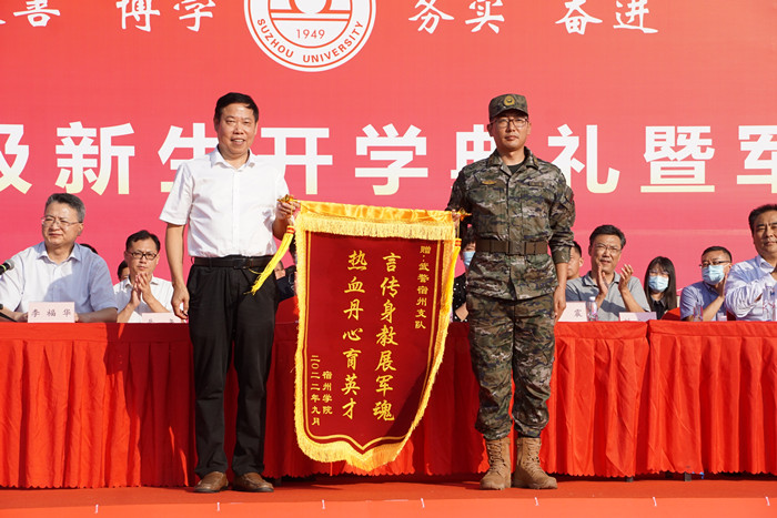 院党委书记汪刘送代表学院向武警宿州支队赠送锦旗。