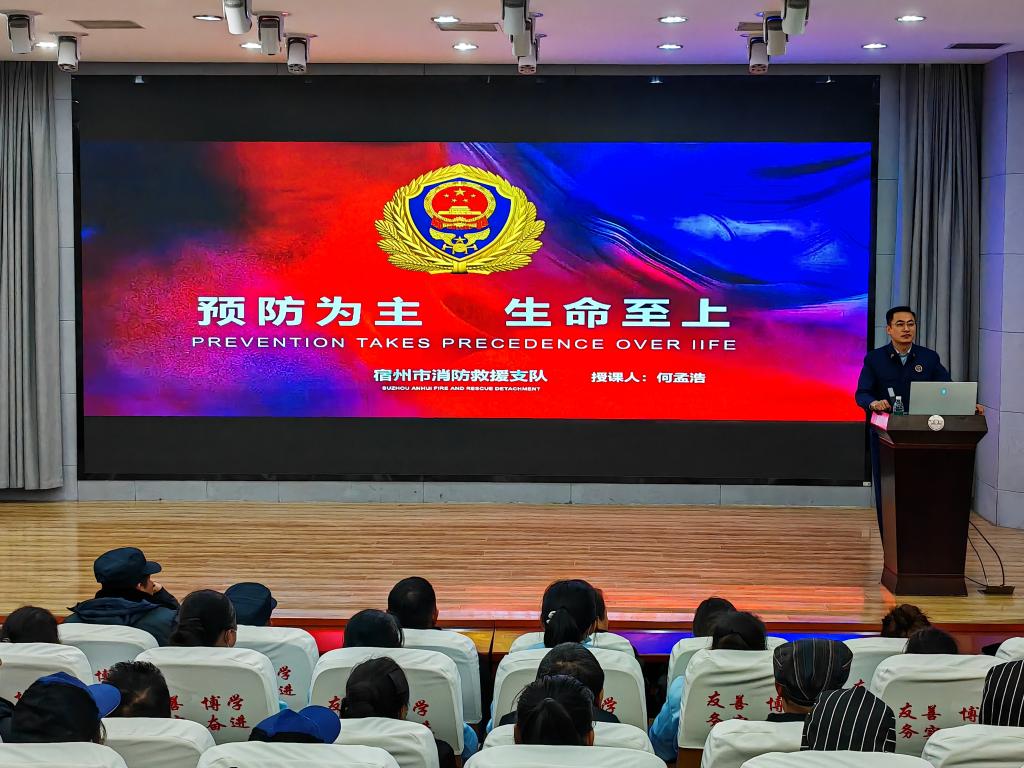 为加强和提高后勤服务人员消防安全意识,2024年3月6日下午,保卫处特邀宿州市消防支队消防宣讲员何孟浩在教育园区校区招聘大厅内,开展组织以“预防为主、生命至上”为专题的消防安全知识培训讲座,我校第三方服务公司150余名职工到场参与。