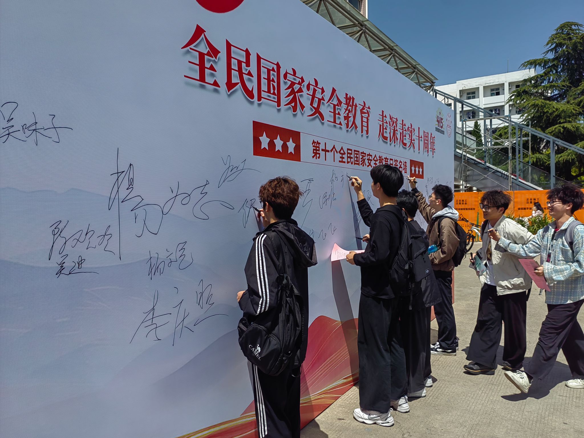 11 时 30 分,校园一食堂门前的主题活动现场气氛热烈。校党委常委、副院长杨维志率先在 “全民国家安全教育走深走实十周年” 签名墙上郑重署名,并向在场师生发出号召:“国家安全是安邦定国的重要基石,每位师生都应强化国家安全意识,自觉成为总体国家安全观的践行者与传播者。” 随后,各学院师生代表有序参与签名,现场工作人员同步发放包含政治安全、网络安全、反间谍法等内容的普法宣传单。