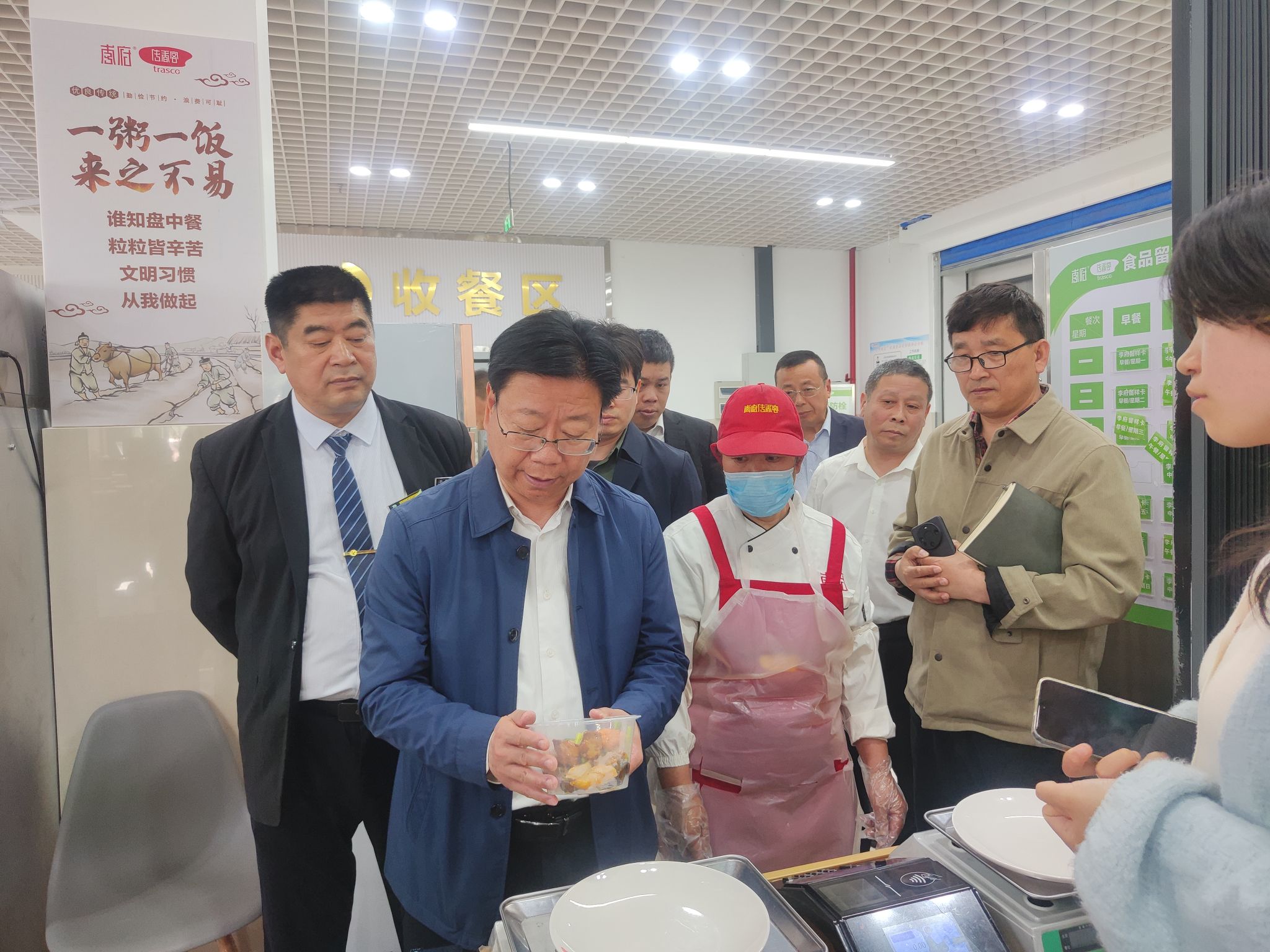 杨维志一行首站抵达学校食堂。校领导高度重视食品安全问题,对食堂后厨操作间、食材储存仓库等区域进行了细致查看,重点检查了食物留样制度执行情况,详细了解每餐次食品留样的品种、数量、时间及储存条件,确保留样规范可追溯。