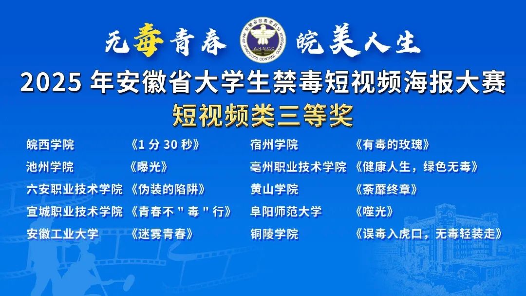 近日,“无毒青春 皖美人生”2025年安徽省大学生禁毒短视频、海报大赛颁奖结果揭晓,宿州学院创作的作品《有毒的玫瑰》荣获短视频类三等奖 。